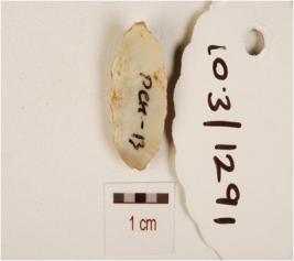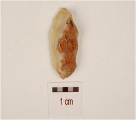 | Description / विवरण | A chert utilized flake with flake scars on dorsal, bulb on ventral and use-wear marks on edge. |