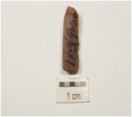 | Description / विवरण | A blade made of chert with a mid ridge on dorsal, use-wear marks along the cutting edges and prominent bulb. |
