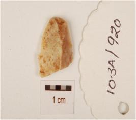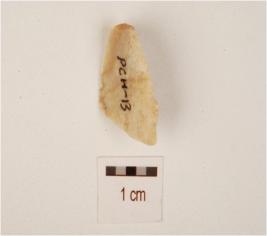 | Description / विवरण | A chert flake made on end struck flake, flake scars on the surface, prepared platform on the proximal end and use marks on the cutting edges. |