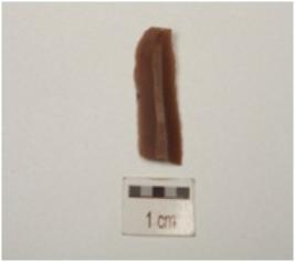 | Description / विवरण | A blade made of chert with a mid ridge on dorsal, use-wear marks along the cutting edges and prominent bulb. |