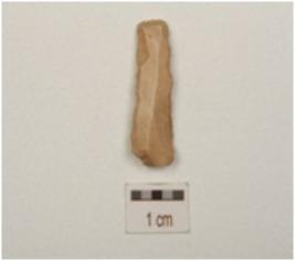| Description / विवरण | A fragment of blade made of chert, bulb on ventral, ridge on dorsal, prepared platform and partly retouch on cutting edges. |