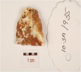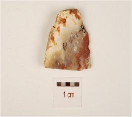 | Description / विवरण | A flake made by chalcedony, prepared platform on the proximal end and middle ridge on the surface and diffused bulb on the ventral side. |