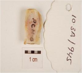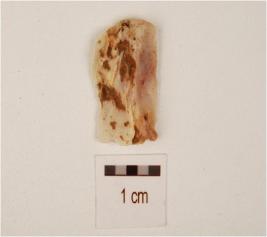 | Description / विवरण | A chalcedony blade, flake scars on the surface, prominent bulb on the ventral side, prepared platform on the proximal end and use wear marks on the cutting edge. |