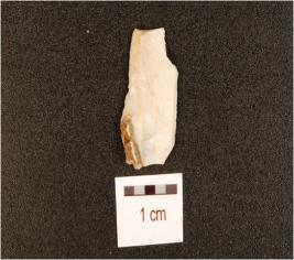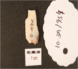 | Description / विवरण | A chert blade, flake scars and cortex on the surface, prepared platform on the proximal end and use marks on the cutting edges. |