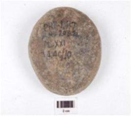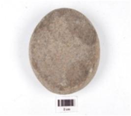 | Description / विवरण | A hammer stone made of quartzite, circular in shape, rough surface, slightly chipped off edge and pitting marks visible on the periphery. |