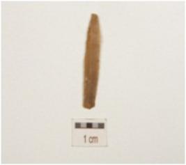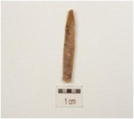 | Description / विवरण | Fragment of blade made of chert, prepared platform proximal end, ridge on dorsal bulb of percussion on ventral and sharp cutting edges. |