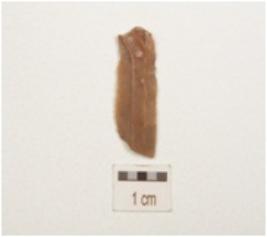 | Description / विवरण | Fragment of blade made of chert, 2 ridge on dorsal prepared platform on proximal end and partly retouch on cutting edges. |