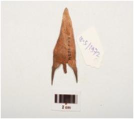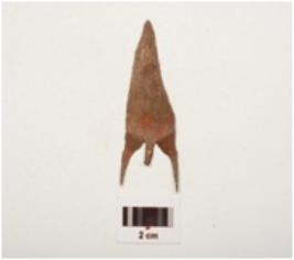 | Description / विवरण | Copper arrow head flat surface, broken tang thin in section and barbed. |