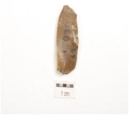 | Description / विवरण | Chert blade, prominent bulb with striking platform, use-wear marks on working edges and one ridge on dorsal surface. |