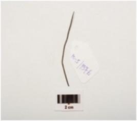 | Description / विवरण | Copper needle pointed one end other end is flat, thin in section polished surface. |