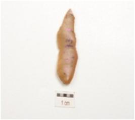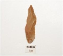 | Description / विवरण | Chert blade, prominent bulb with striking platform, pointed distal end and wear marks on working edges. |