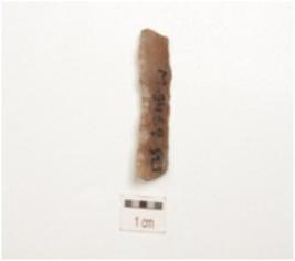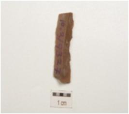| Description / विवरण | Chert blade with one wavy and another straight cutting edge, both ends broken, traingular cross-section and wear marks on working edges. |