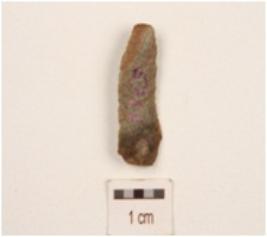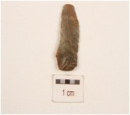 | Description / विवरण | Parallel sided chert blade prominent bulb with striking platform on ventral surface, use wear marks on both working edges and a ridge on dorsal surface. |
