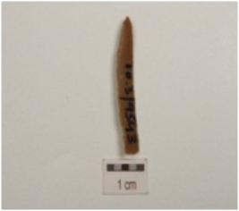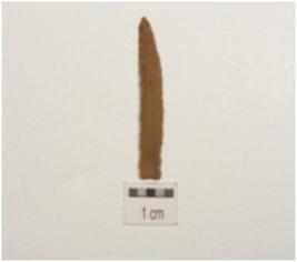 | Description / विवरण | Fragment of chert blade with use wear marks along cutting edges and prominent ridge along cutting edges. |