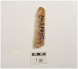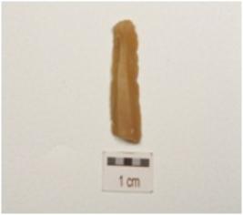 | Description / विवरण | Fragment of parallel sided chert blade, prominent bulb on ventral surface, two ridges on dorsal surface and trapezoidal cross-section. |