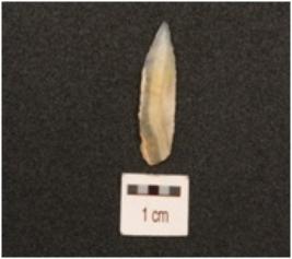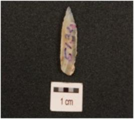 | Description / विवरण | Chalcedony blade, proximal end broken, pointed distal end, use wear marks on both working edges and a vertical ridge on dorsal surface. |