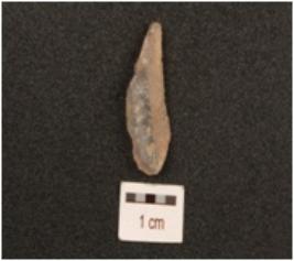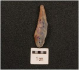 | Description / विवरण | Chalcedony backed blade, backing visible, use wear marks on working edge, diffused bulb on ventral surface and a vertical straight ridge on dorsal surface. |