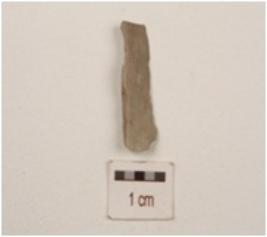 | Description / विवरण | Chert backed blade, both ends broken, use wear marks on working edge and a ridge on dorsal surface. |