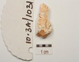 | Description / विवरण | A chert utilized flake with cortex on surface and use wear marks on edges. |