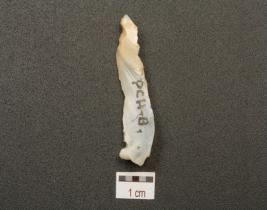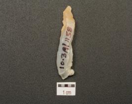 | Description / विवरण | A blade made on chert, double ridge and bulb on ventral side, use marks on working edges and trapezoidal cross section. |