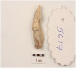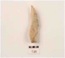 | Description / विवरण | A blade made on chert, with ridges on dorsal side, use wear marks on working edges and triangular in section. |