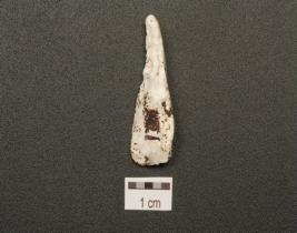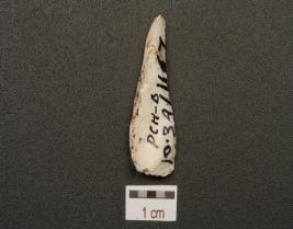 | Description / विवरण | A blade made on chert, bulb on ventral side and single ridge on dorsal side, use marks on working edges and triangular cross section. |