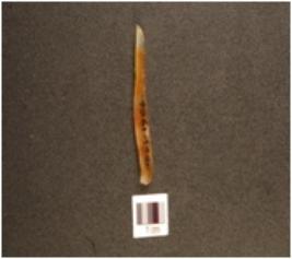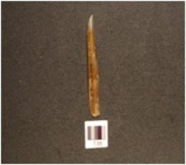 | Description / विवरण | A pen knife blade, made of chalcedony, double ridge on dorsal, trapezoidal cross-section and use-wear marks on cutting edge. |