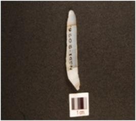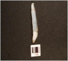 | Description / विवरण | A chalcedony blade, prominent mid ridge on dorsal, prepared platform, bulb on ventral, use wear marks on cutting edge and triangular cross-section. |