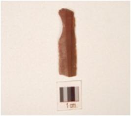| Description / विवरण | Chert blade with triangular cross section, mid-ridge on dorsal side, use-wear marks along the cutting edge, prepared platform and bulb absent. |