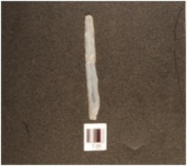 | Description / विवरण | A chalcedony blade with double ridge on dorsal, use-wear marks on cutting edge and trapezoidal cross-section. |