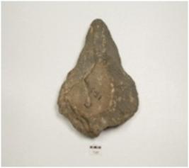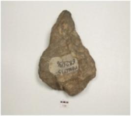 | Description / विवरण | Quartzite bifacial scraper, flake scars on both sides, partly broken at one end, wavy blunt working edge and trapezoidal cross section. |