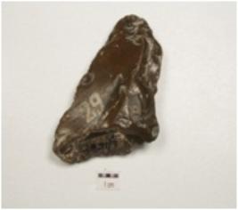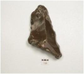 | Description / विवरण | Chert bifacial scraper, ridge on dorsal side, striking platform, flake scars on both sides, irregular retouches on working edge and triangular corss section. |