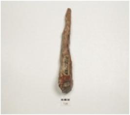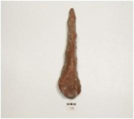 | Description / विवरण | Chert bifacial point, striking platform, ridge on dorsal, flake scars on both sides, thick at one end, wavy working edge along at long tapered end and triangular cross section. |