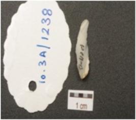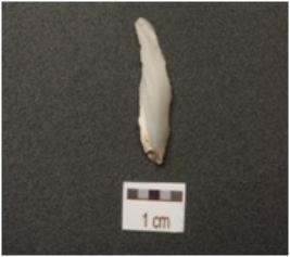 | Description / विवरण | A chert blade with wear marks along cutting edges, prominent ridge on dorsal surface and triangular cross-section. |