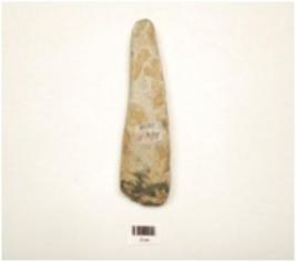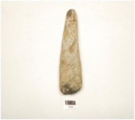 | Description / विवरण | A dolerite stone adze, polished surface, flat inner surface, convex outer surface, spherical at one end, broad working edge, thick sides and plano convex cross section. |