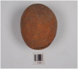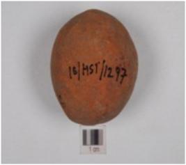 | Description / विवरण | A terracotta sling ball, round in shape and smooth surface treated with red slip. |