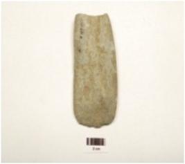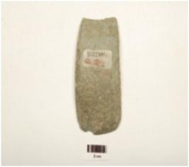 | Description / विवरण | Fragment of dolerite stone adze, polished convex outer surface, flat inner surface, thick sides, sharp edge and rectangular cross section and partly broken at one end. |