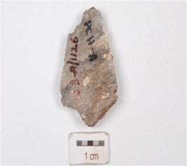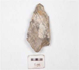 | Description / विवरण | A flake made on chert stone, flake scars on surface, prominent bulb on ventral side and irregular edges. |