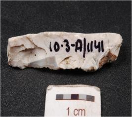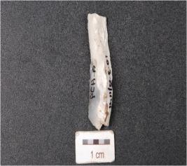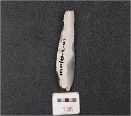 | Description / विवरण | A blade made on chert stone, mid ridge on surface, diffused bulb on ventral side and use marks on edges. |