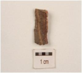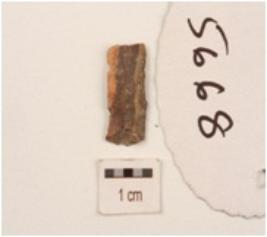 | Description / विवरण | Fragment of chert blade with use wear marks along cutting edges, a prominent ridge on dorsal cortex visible and triangular in section. |