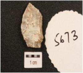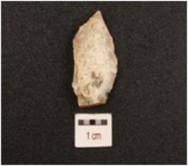 | Description / विवरण | Utilized flake made of end struck chert flake, prominent bulb on ventral use wear marks along cutting edges, flake scars on dorsal and smooth surface. |
