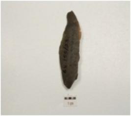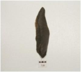 | Description / विवरण | Chert blade, a prominent ridge on dorsal side, striking platform, diffused bulb on ventral side, partly broken along at distal end, use wear marks along at cutting edges and triangular cross section. |