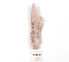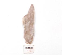 | Description / विवरण | A blade made on chert stone, mid ridge on dorsal surface, ventral surface is smooth, distal end is broken and irregular cutting edges. |