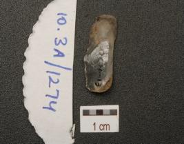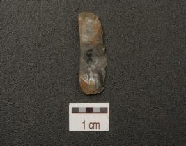 | Description / विवरण | End struck quartz flake, prominent bulb on ventral surface and wear marks on cutting edge. |