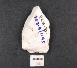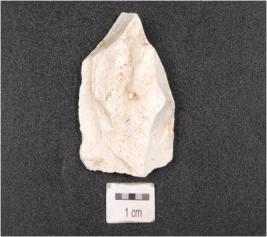 | Description / विवरण | An utilized flake made on chert, bulb and platform absent and use-wear marks along sharp edges. |
