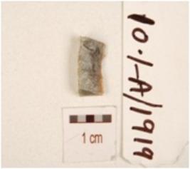 | Description / विवरण | Fragment chert blade with triangular cross section and use-wear marks along the cutting edge. |