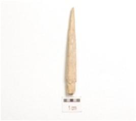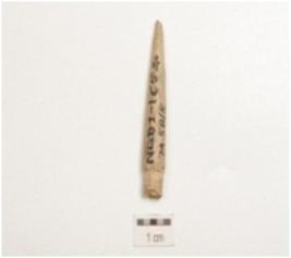 | Description / विवरण | Fragment of projectile point on bone, one end tapering to pointed end and other is broken. |