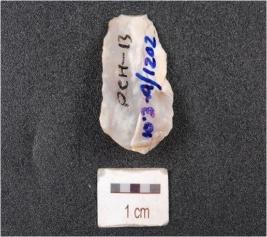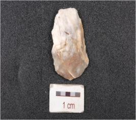 | Description / विवरण | An end struck utilized flake on chalcedony, prepared platform, diffused bulb on ventral side and use-wear marks along sharp edges. |