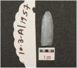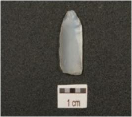 | Description / विवरण | A chalcedony blade ridges and flake scars on the surface, use marks on cutting edge, prepared platform and bulb on ventral side. |