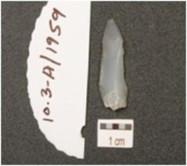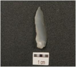 | Description / विवरण | A chalcedony blade, ridges and flake scars on surface, prepared platform and bulb on ventral side and use marks on cutting edge. |